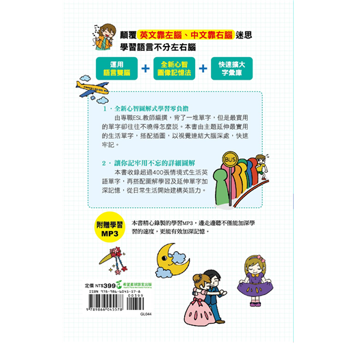 背了一堆單字,但是最實用的單字往往不知道該怎麼說嗎?本書收錄超過400張情境式生活英語單字,再搭配圖解學習及延伸單字加深閱讀,再以閱讀搭配MP3延伸口說能力,同時培養英文敘述能力。