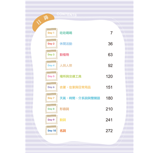 英語現在已經是國際的共通語言,也是台灣學生必學的第一外國語。無論你學英文的初衷是什麼,單字必定是在接觸到英語的第一關卡。本書共有十大單元,個別單元選用單字總表→全新心智圖圖解→圈選正確的中文→句型練習及單字填空→看圖填單字共五階段加強圖像及文字的連結,讓英語不再枯燥乏味,更能輕鬆應付生活上的日常對話。