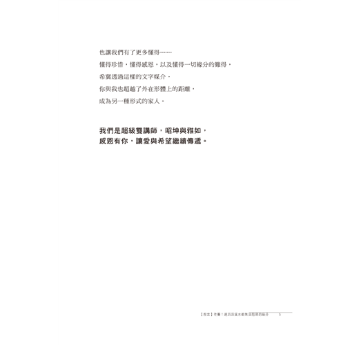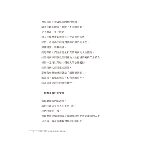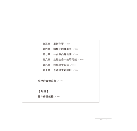 看似悲慘的輪轉人生,因著對生命的熱愛,再度滾動得無比精彩——成為桌球國手、生命教育講師、協會理事長、董事、委員、督導⋯⋯等多項頭銜,這都是意外所造就的意外人生呀!現在,我能以笑看人生的態度,從輪椅的視野望見寬廣世界,繼續輪轉乾坤,創造生命的價值。