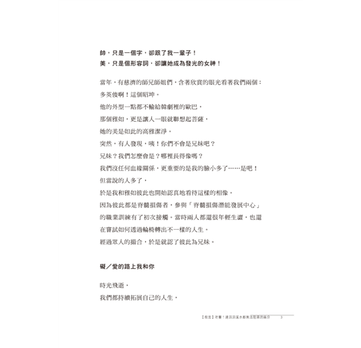 坐在輪椅上看世界,世界仍然在我的雙腳下被踏出一條康莊大道,每個人的人生都不一樣,生命也不會只有一種形式呈現,我,只是用不一樣的方式走路而已……。