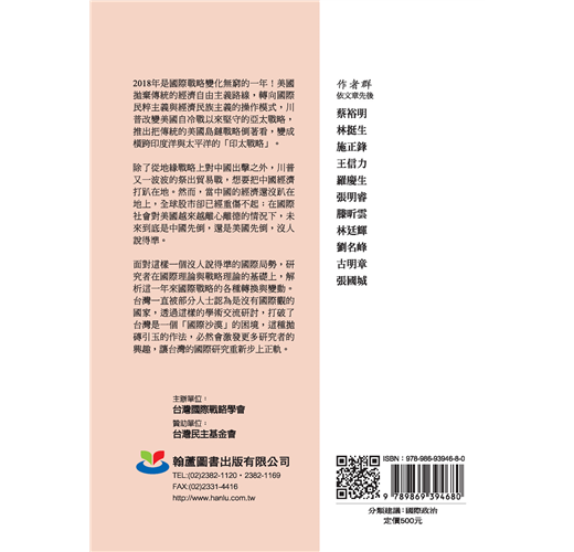 2018年是國際戰略變化無窮的一年,美國拋棄傳統的經濟自由主義路線,轉向國際民粹主義與經濟民族主義的操作模式,川普改變美國自冷戰以來堅守的亞太戰略,推出把傳統的美國島鏈戰略倒著看,變成橫跨印度洋與太平洋的「印太戰略」。