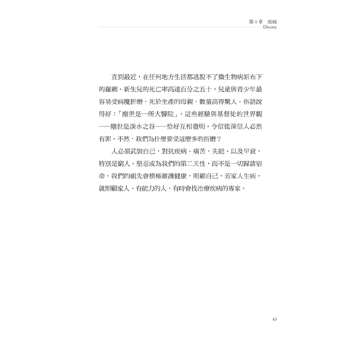 包括:疾病(第一章);各種治療疾病的人(第二章);對身體的研究(第三章);
