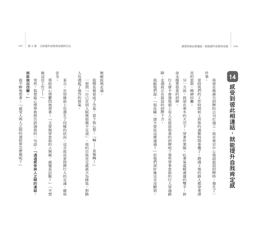 我擔任諮商心理師多年,看過許多來諮商的人不斷提升自我肯定感後,人生所出現的改變。和之前不同,聚集在他們身邊的,都是會珍惜他們的人。不只如此,個案愈能肯定自身價值,身旁的人也愈能一同提升自信,大家都變健康了。
