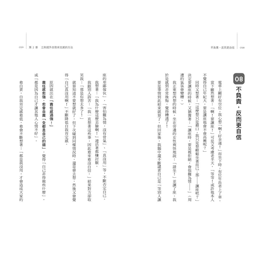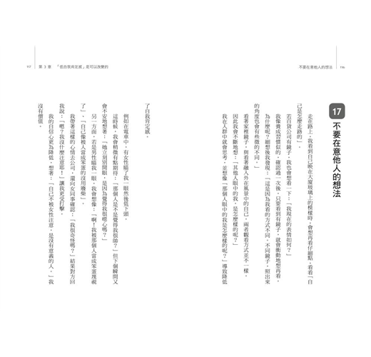 我以為無法肯定自我是因為「意志軟弱」,或是本身個性就怯懦膽小,但我錯了。我終於認清:「我們只是自顧自的演出沒自信的角色罷了!」