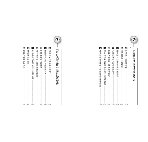 本書寫出「自我肯定感高」及「自我肯定感低」的人,他們身上不同的特質,並且告訴大家簡單提升自信,過著「美好生活」的方法。