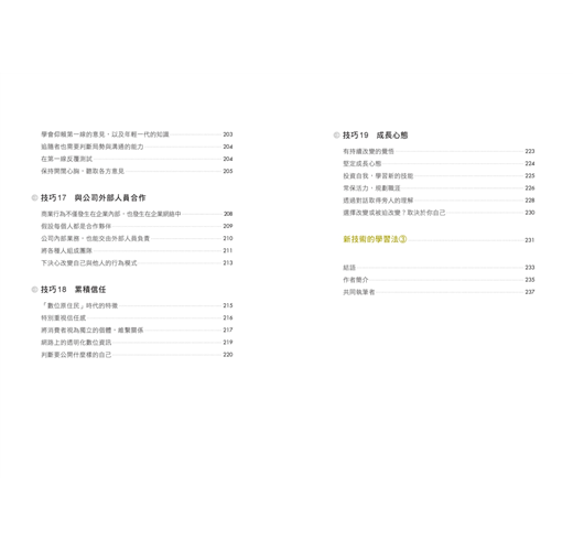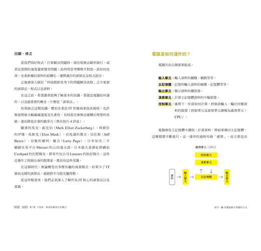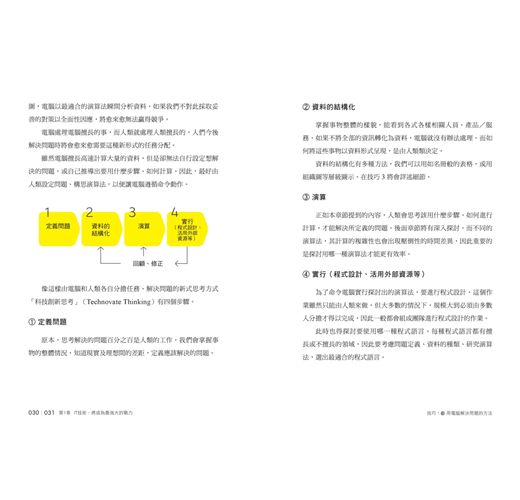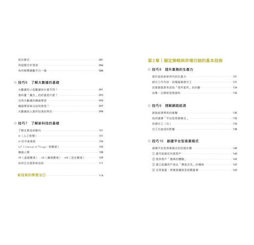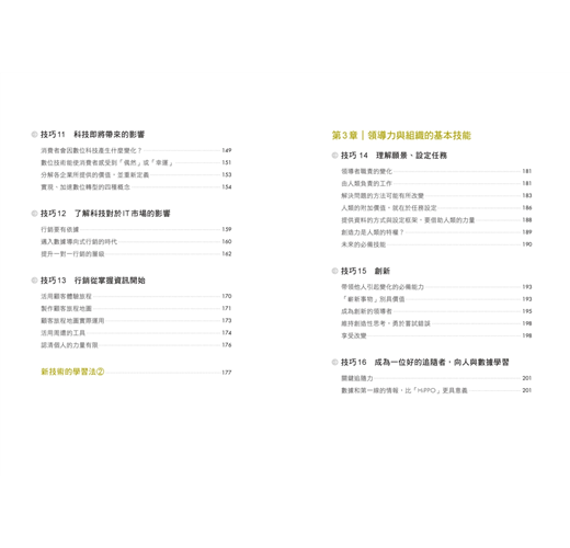 全書內容包括:第1章【電腦與資料的基本技巧】介紹電腦、資料,以及有關演算法的基本知識與技巧,諸如例如電腦如何處理檔案資料,演算法的重要性及其原理。第2章【擬定策略與市場行銷的基本技術】則是依序介紹現今在職場上必備的科技新知,並且解說技術的最新動向。第3章【領導力與組織的基本技能】談的是因應科技發展之下,組織架構的基本知識與技能。你可以學到: