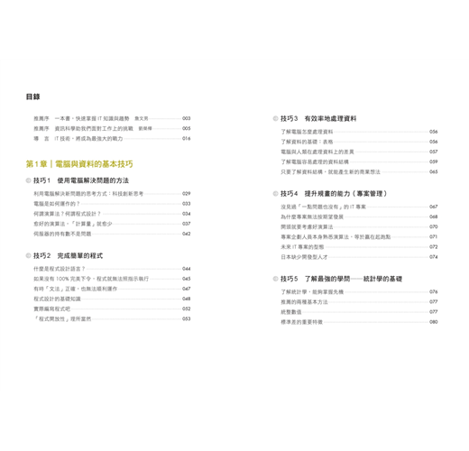 本書提到的「IT 技術」,不是指Excel 的使用方法或其他應用程式的小技巧,而是程式設計、統計學等等,一般商務人士在工作上雖然不需成為科技專家,仍必須具備一定的素養,才能在工作中運用自如,在職場上創造嶄新的價值,並使工作效率大幅提升。能不能掌握這些知識,足以大幅左右工作的成果。因此,IT 知識會是提升工作基礎技能的要件。