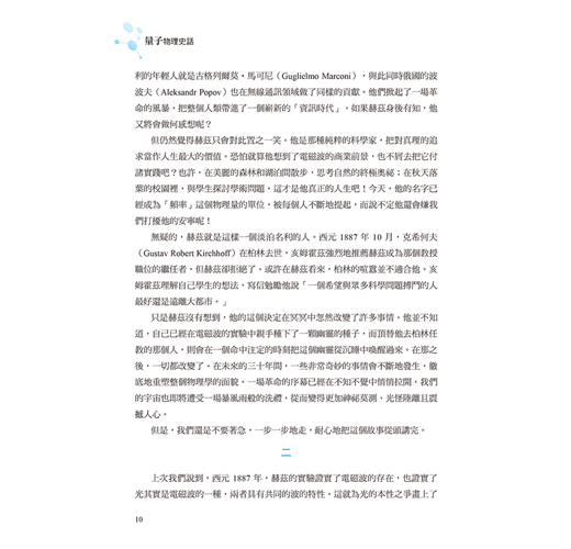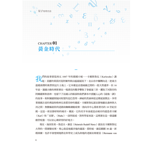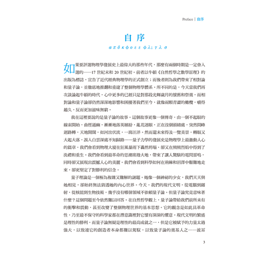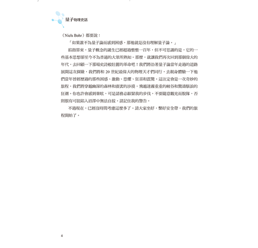 我在這裡要說的是量子論的故事。這個故事更像一個傳奇,由一個不起眼的線索開始,曲徑通幽,漸漸地落英繽紛,亂花迷眼,正在沒個頭緒處,突然間峰迴路轉,天地開闊,如河出伏流,一瀉汪洋。然而還未來得及一覽美景,轉眼又大起大落,誤入白雲深處不知歸路……量子力學的發展史是物理學上最激動人心的篇章,我們會看到物理大廈在狂風暴雨下轟然坍塌,卻又在熊熊烈焰中得到了洗禮和重生。我們會看到最革命的思潮席捲大地,帶來了讓人驚駭的電閃雷鳴,同時卻又展現出震撼人心的美麗。我們會看到科學如何在荊棘和沼澤中艱難地走來,卻更堅定了對勝利的信念。