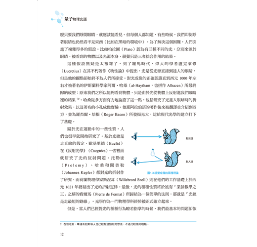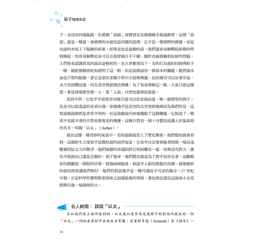 說起名留歷史的科學家們,往往只是教科書上死板板的名詞,但本書作者以最人性化的筆法描寫,每位科學巨擘的性格鮮明,躍然紙上,像是:小器又斤斤計較的牛頓怎麼成為科學巨人;量子的創始人普朗克卻被自己離經叛道的思想深深困擾,變得畏縮不前;一頭亂髮仍掩不住眼中堅決的愛因斯坦,如何力抗量子論的歷史洪流……