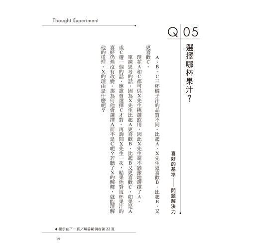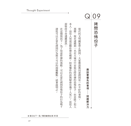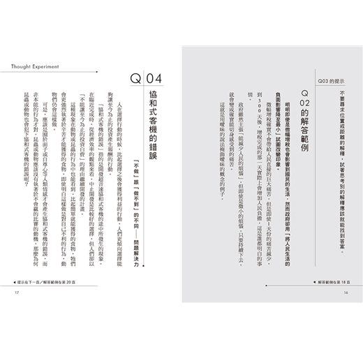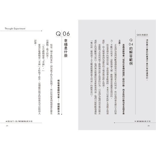 思考實驗對培養思維能力有很大幫助,它是古今中外哲學家們的思考工具。而且透過有趣的對答形式,在遊戲中激發創意思維。從此發現思考是如此愉快,讓你的頭腦更加清晰!