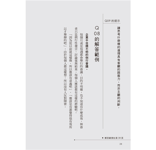 我們每天在職場與私生活中都會面對到各式各樣的問題,在職場上或許有一套大家慣用的解決方法。但是這個「慣用」的解決方法真的是正確的嗎?此時我們應該要從1開始,透過理性的思考找尋別的方法。當找到疑問時,透過不斷質問,能找到新的回答也說不定。