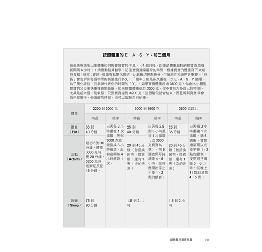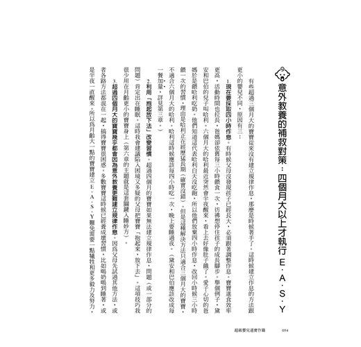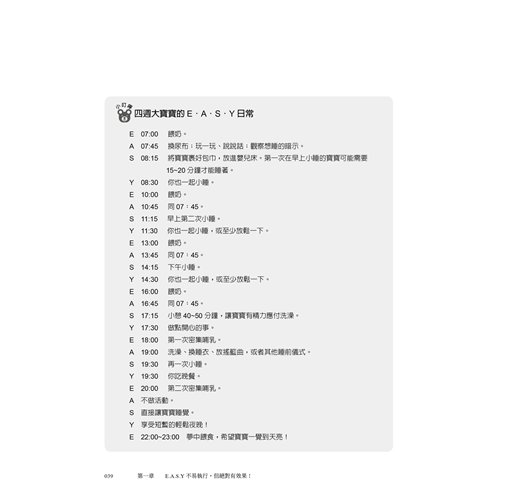 什麼是「E˙A˙S˙Y 」?簡單來講,就是吃飯(E)、活動(A)、然後睡覺(S),拆卸睡覺前要吃奶的期望,父母就可以擁有自己的時間(Y)。這樣一來,寶寶能學會自我慰藉、不需要依賴媽媽的胸部或是奶瓶。