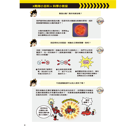 設有「X戰隊小百科」單元,藉由X機器人戰隊隊員的生動對話和淺顯易懂的文字,來介紹能源與能量的種類,以及釷能源、太陽能、暗物質、反物質、原子構造、同素異形體、太陽能車、風力發電機等超炫科學知識,讓小朋友有系統的學習。