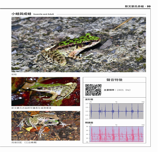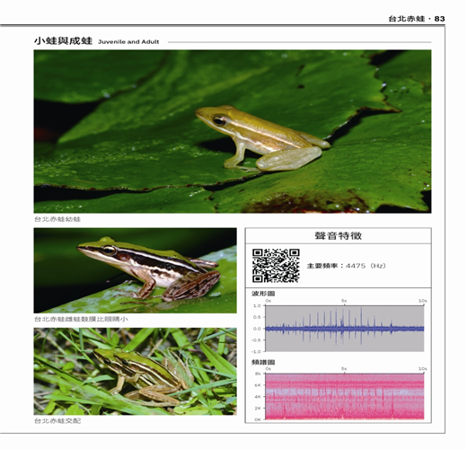 黑夜裡,悅耳的蛙鳴不但是牠們溝通的重要訊息,也是人類鑑別蛙種的重要線索。這本圖鑑還有一個特殊的創舉:在書中呈現了各種蛙類的鳴唱聲譜圖。藉由書中所附的QR code,每個人都可立即透過網路找到各種青蛙的鳴唱,並與野外聽到的叫聲做比對。這種貼心的設計,勢必可讓手持圖鑑的野外觀察者如虎添翼!我特地掃描了書中的QR code,試圖分辨太田樹蛙和日本樹蛙的差異,也想聽聽看王氏、碧眼這兩種樹蛙,和典型的艾氏樹蛙到底有什麼不同。沒錯!近五年發表的王氏、碧眼、太田這三種樹蛙,也已經全數收錄在本書之中。