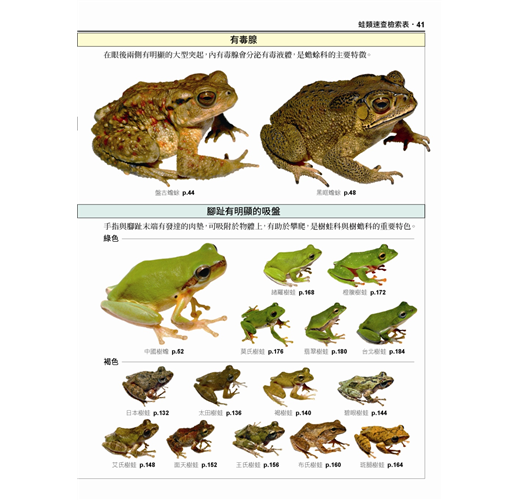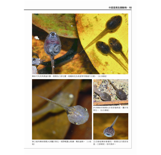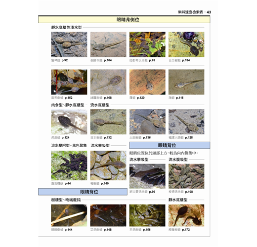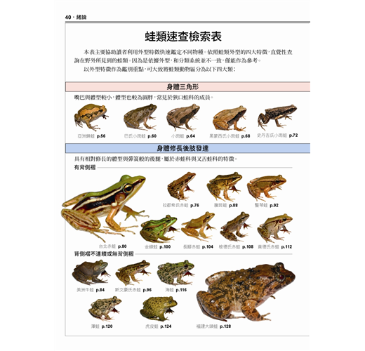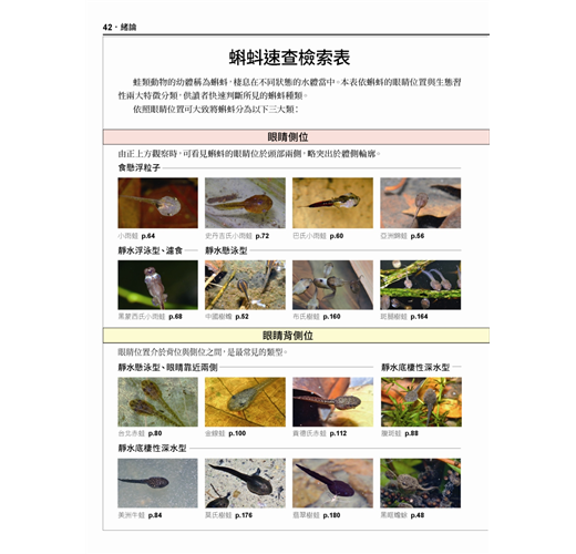◎除原有蛙類速查表之外,另收錄有最新的蝌蚪速查表,方便讀者由蝌蚪時期就能直覺辨識物種。
