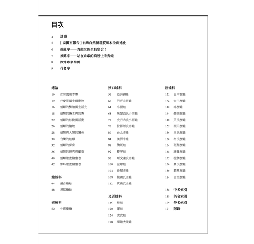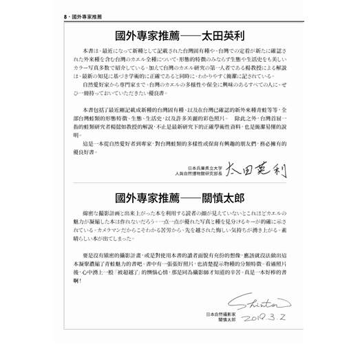看著楊老師搭乘台鐵奔波於大小城鄉,在台灣各地推廣蛙類的保育教育,身為後輩的我們常感驚訝:老師怎麼會有這麼強大的決心、毅力和熱忱,來完成如此大量的教育研究工作?本書不但是台灣目前最完整的蛙類圖鑑,也代表了國人對自然多樣性探索的努力成果。希望透過楊老師這本圖鑑,吸引更多的人,一起來關注這群唱作俱佳的小動物!