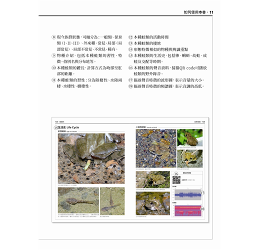 ◎只要打開手機掃描QR code,即可在閱讀的同時,聽見蛙類動物在自然中的實際鳴聲,是以往圖鑑不曾包括的重要辨識資訊。