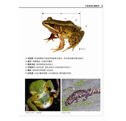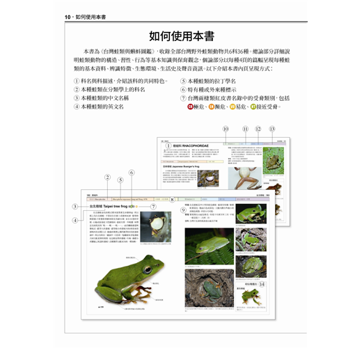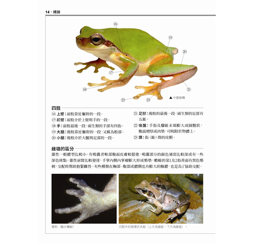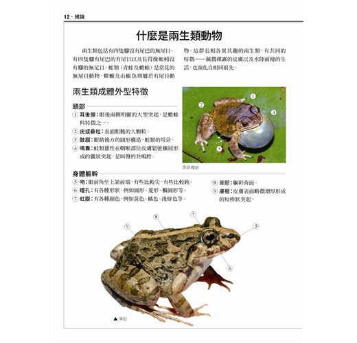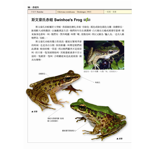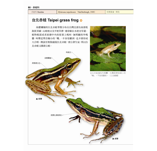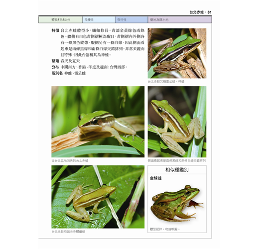 本書特點:◎每種蛙類皆有清晰的成體拉線去背圖,清楚說明辨識特徵之外,也記錄了牠們的學名、別名、分布地區、食性、習性、繁殖期等詳細資料。