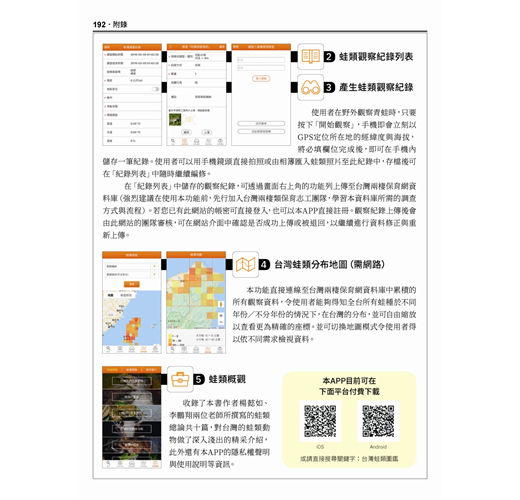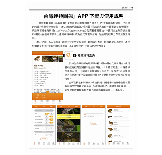 更重要的,本書還可配合2018年11月上架的「台灣蛙類圖鑑」APP使用,能夠以「兩棲保育網」資料庫相連結,令讀者能夠化身為公民科學家,將在野外觀察到的蛙類動物,上傳到兩棲保育網的蛙類分布地圖資料庫中,一起參與台灣野外的蛙類普查。