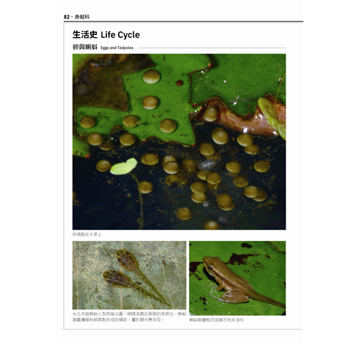 除了有詳細的總論介紹蛙類動物的基本構造、知識、觀察方式與保育觀念之外,以每種4頁的篇幅收錄了每種蛙類的去背特寫、生態照、還有由卵至蝌蚪的完整生活史,以及首次為辨認蝌蚪而設計的蛙類速查表,是台灣目前最新、收錄最為完整的蛙類全圖鑑。