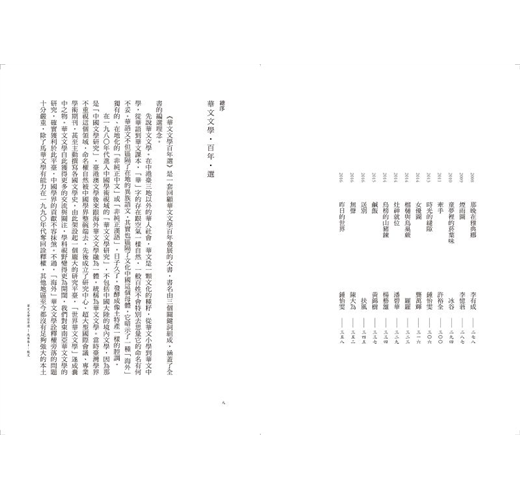 一九一八年魯迅發表〈狂人日記〉,正式揭開中國現代文學乃至全球現代漢語寫作的序幕,至今已百年。二○一八年為了迎接九歌出版社創社四十年,推出由陳大為、鍾怡雯主編的「華文文學百年選」。這是一套百年精選文集,涵蓋發展得最為成熟的四個華文文學板塊:臺灣、中國大陸、香港、馬華。選篇方向多元,包括改寫現代文學史地景的經典、膾炙人口的名篇、各世代的先鋒力作,以及被主流視野忽略的另類佳構。「華文文學百年選」係以編年史的概念收錄,並按照發表的年代排序,選出當年度最具文學指標性的代表作,每篇文末附上作者的精簡小傳。