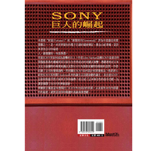 究竟索尼(SONY)是如何成為進擊的巨人?作者約翰‧納森 (John Nathan)追溯索尼(SONY)從東京炸彈傷痕累累的廢墟到其目前在全世界成功的奇蹟式演變,憑藉著他在日本文化方面獨特的專業知識以及對SONY內部密室獨特無限制的訪問,納森記錄了公司的發展過程,特別關注SONY如何設計和開發產品,他更深入研究SONY高利潤Trinitron系列的誕生以及隨身聽的誕生,並注意SONY是如何與競爭對手保持差異和優勢,而完成了這本傳奇性的故事書籍,為讀者揭開了SONY的神秘面紗。