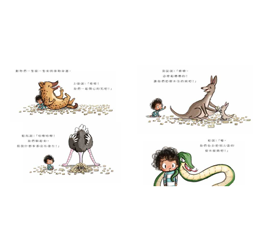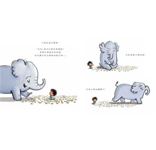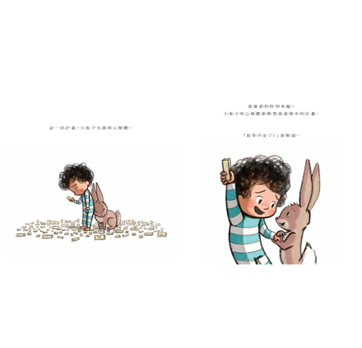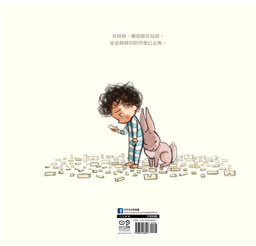 汪仁雅/繪本小情歌推薦 回想一下,你是否也有過這樣的經驗:花了無數的時間和精力去完成某件事,為自己的表現感到驕傲欣喜,卻因為突發狀況,所有的心血通通付之一炬。沮喪、挫折與埋怨,讓你久久無法釋懷,無論別人怎麼安慰你都沒用。那麼,換個角度思考,連成人都難以消解的複雜情緒,孩子又該怎麼梳理這樣的糾結? 科里.杜若菲德(Cori Doerrfeld)將故事場景置放在孩子的日常,小泰勒用積木費盡心思打造出一個新穎又特別的作品,卻因為不可預期的意外,瞬間就傾頹倒塌。散落一地的積木,像極了孩子深沉的失落,無法挽回的遺憾。故事轉折是安排不同的動物出場:熱心小雞覺得好好談談有用、小熊認為大吼大叫發洩情緒最好、小象打算幫忙恢復原樣,或者跟土狼一起笑笑就沒事了,學鴕鳥把頭埋起來當作沒發生,還是乾脆跟著狡詐的蛇一起去推倒別人的積木。每個人都要找到適合處理自己情緒的方式,只是沒有一樣能撫慰小泰勒的沮喪。 這些建議看起來是不是很熟悉?故事結合動物的特質,同時也為孩子提供多種處理情緒的方式。更重要的是,成人總是習慣要「解決」孩子的問題,積極的介入,花很多力氣去探究孩子的情緒,恰恰忽略了他們內心真正的需求──他們需要的是預留一個沉澱心情的距離。 故事用極為簡潔的圖像呈現,沒有多餘的背景或物件,為的就是聚焦在孩子身上,讓孩子的內心與外顯表現被理解與看見。以動物代表成人觀點,透過對話與互動演示,更深一層的揭示出孩子需要的是「傾聽」和「陪伴」,給予他支持,而不是把自己的感受或理解加諸在孩子身上,故事裡的小兔子就是這樣: 「小兔子越靠越近, 直到泰勒可以感受到他溫暖的身體。 他們靜靜的坐在一起, 直到泰勒對小兔子說:『請留下來陪我』。」 細看圖畫的連續動作,小兔子先是輕輕地靠近泰勒,跟他背貼背、彼此寬慰地緊緊擁抱、雙手交握的溫暖,然後接連用了五個「用心傾聽」;所謂的傾聽,是專注的用心、用感情聆聽,全然接納,靜靜等待泰勒自己打開心房,把主動權交回給孩子。當孩子感到心安,就會像故事裡的泰勒,有了可以傾訴宣洩的對象,就開始滔滔不絕的說、大吼大叫掉眼淚,讓漫溢的情緒一一傾瀉。 等待與陪伴不是口號,而是為孩子預留一個安心的空間,直到那個「適當的時機」出現;而成人需要做的,只是一份可依賴的靜定,全心全意地傾聽就好。