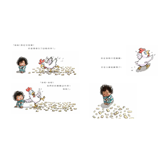 有一天,泰勒決定用積木蓋個東西。 蓋個既新穎、又特別、又令人嘖嘖稱奇的東西。 泰勒得意極了。 然而就在那一瞬間…… 他蓋的東西全塌了下來。 小雞是第一個發現這件事情的。 「咯咯!真是可惜啊! 好遺憾發生這樣的事!」 「來來!我們好好聊聊這件事!咯咯!」 但是泰勒不想聊。 於是小雞就離開了。