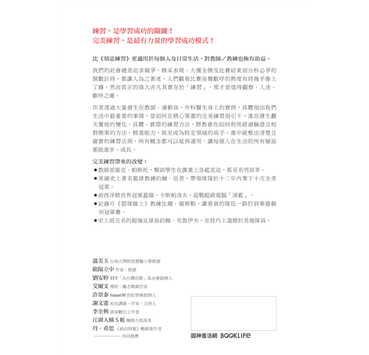 ★★★★★「本書就像《刻意練習》的實踐版,其核心是要讓你學會最有效的練習方法,並讓你對練習改觀,學會正向的擁抱練習。除了一般人,它也非常適合具有教師與教練身分的人,不論是學校老師、訓練講師、商業教練或運動教練,都有值得借鑑之處。」──艾爾文