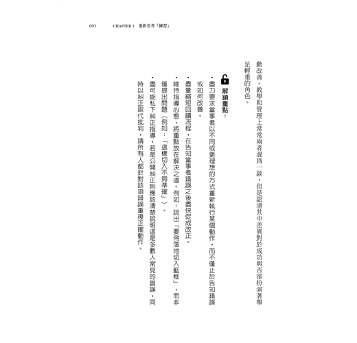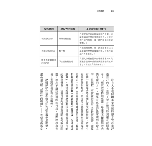 另外,身為第一線教師在現場實踐得多,卻也可能無意間把成功且最關鍵的細節忽略,甚至往反方向前進卻不自知。我對書中提及:「評判」和「糾正」的差別很感興趣。作者說:「評判是告知當事者如何改進,而糾正則會更進一步回頭以不同方式再進行,而且越立即糾正成效越理想。」的確沒錯!教學為何常常無效,因為我們總以為說了(甚至做了)一遍示範,學習者也應該明白,但現實卻非如此。