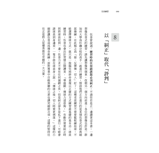 我們需要的是練習──「完美練習」,而不僅是再三重複動作。麥可.喬登曾說過:「就算每天練習投籃八小時,如果用錯方法,也只不過是善於亂投球罷了。」練習留下的影響難以抹滅。