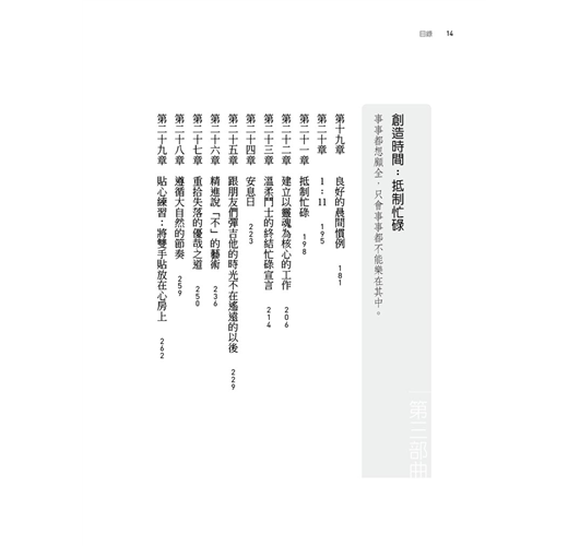這本書一步步教導讀者將焦點慢慢收攝回自己身上⋯⋯「讓心臨在」,然後方能看清外在雜亂的空間其實是內心慌亂的投射,⋯⋯回歸本心,才能ㄧ步步學會如何建構自己真正想要的身心品質。