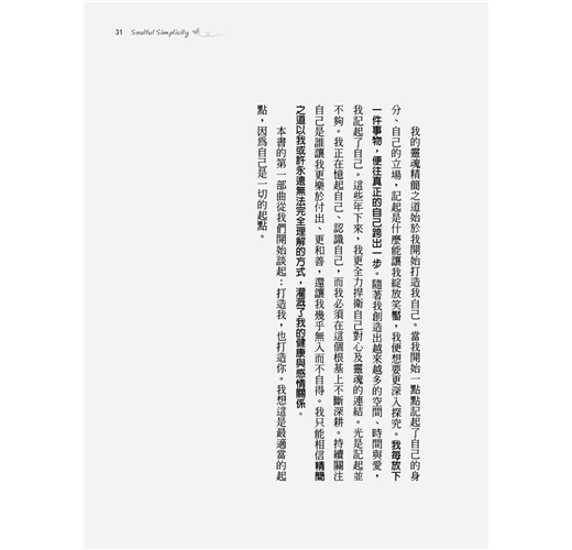 我會告訴各位我的病情診斷,但這本書不是要談我的多發性硬化症。我想談的是多發性硬化症啟發了我做出什麼改變。起初,我以為這場病會毀了我的一切,事實上它卻是在各方面拯救了我。當我得知壓力會嚴重傷害多發性硬化症的患者、自體免疫疾病的病人,以及所有承受病痛的人,我決定要竭盡所能地消弭壓力。我要帶著多發性硬化症好好過日子,要活得比確診之前更有品質。當我刻意放慢腳步,簡化生活,便立刻看到療癒的效果,而大部分的療癒跟多發性硬化症無關。我開始摸索身體的需求是什麼,而我的心又想要什麼,在這樣的過程中,契合靈魂的簡約之道便悄悄浮現了,並改變了我的生命模式。這不是靈性的覺醒,也不是那種「迷信怪力亂神」的時刻。而是以溫和的態度,老老實實地面對我生命裡最要緊的事。當我開始詢問自己什麼最重要,辨識出什麼無足輕重,我便發現了真正可以打動我的心與靈魂的事物。我花時間聆聽自己的心聲,我學會信任答案,開始過簡單而契合靈魂的生活。