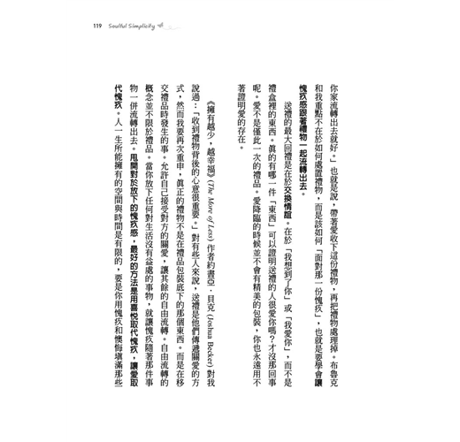 生活的美好,本在於「愛」,在於「活在當下」,在於細細品味生活,在於閱讀、寫作、散步、瑜伽,在於大自然。當心靈充滿平靜,慾望自然減少。生活的簡單,反而快樂。這個道理理解不難,多數人也認同,不過執行起來並不容易。卡佛在書中以四十個學會「放手」的方法,吸引了成千上萬的粉絲仿效,我亦發現其中有許多是我多年來生活的方式。