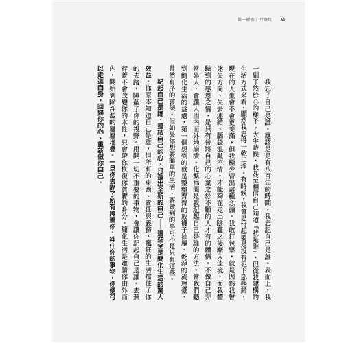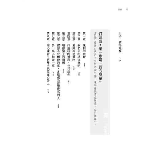 我大刀闊斧地改造了四個生活領域,分別是:健康、空間、時間、愛。我選擇活得精簡,反而從這四個領域得到更多的回饋。我作出的每一項重大改變,都是由幾百個小改變與故事堆疊出來的成果。在後續的章節裡,我會分享這些改變的步驟與故事。我會告訴你是什麼讓我重拾健康與愛,還會請你想一想,什麼樣的作法才適合你。開始思考什麼是你真正要緊的事。如果一開始時你沒有頭緒,別擔心。有時候你得先清除不重要的東西,才會看見真正重要的事物。在每一部曲的結尾,你會看到一個「將雙手貼放在心房上」的聆聽心聲練習,我會列出各式各樣的小步驟,讓你可以邁向你的靈魂精簡之道。當你簡化了生活,你會創造出自己需要的時間與空間,供你聆聽自己的身體、認識你的心、連結到你的靈魂。簡化生活沒有一體適用的方法,希望我的故事會激勵你踏上極簡之路,然後滿載而歸。