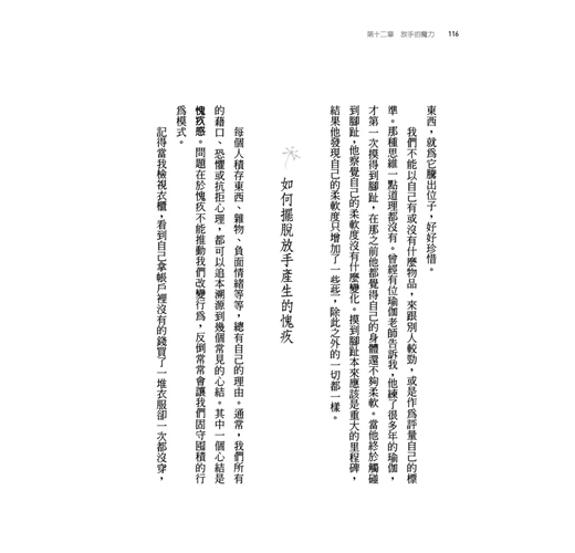 在這個世界上,太多關於極致減法生活的討論只觸及了斷捨生活環境裡的東西,但本書倡導的生活方式則多了另一項要素,也就是滿滿的愛。其中很大一部分是關照自己內心的需求,蔻特妮也教導我們如何聽見來自內心的訊息。