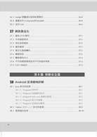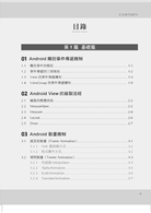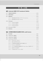 ■ 效能最佳化篇:本篇偏重介紹目前 Android平台常見的效能最佳化相關知識,主要包含程式最佳化、圖片最佳化、電量最佳化、版面配置最佳化和網路最佳化等基礎知識。