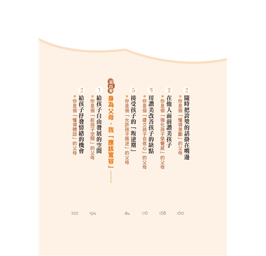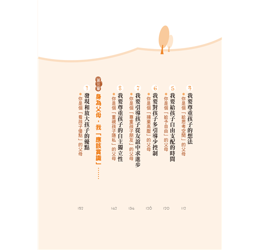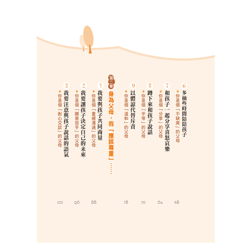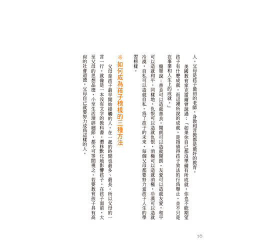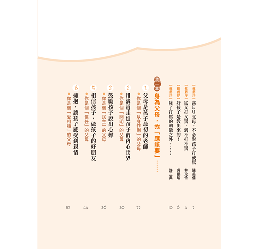 步入二十一世紀,以打罵方式來號令孩子的教養方式早已不合時宜,現代父母除了必須提供基本的照護和關懷之外,更得是以身作則、開明、民主、不缺席、溫和、分享的父母。