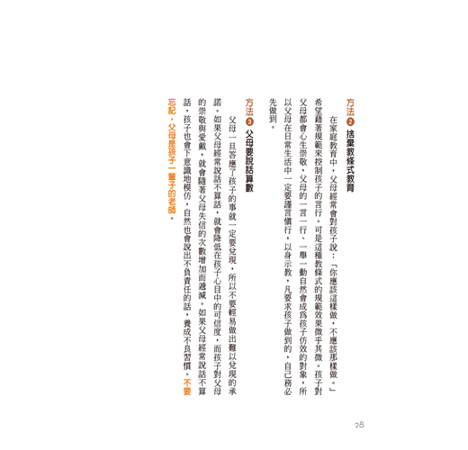 「不打不成器」已落伍,優質的教育不是處罰而是引導;38招 教你以激勵、賞識的方法教養孩子。◆ 現代父母以打罵方式來號令孩子的教養方式早已不合時宜,父母除了必須提供基本的照護和關懷之外,更得是以身作則、開明、民主、不缺席、溫和分享的父母。