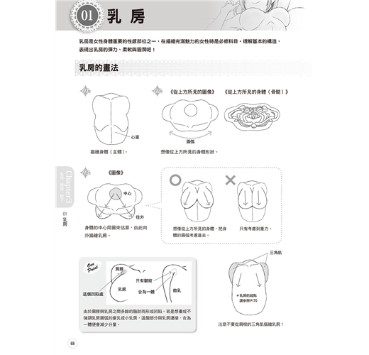 乳房乳房是女性身體重要的性感部位之一,在描繪充滿魅力的女性時是必修科目。理解基本的構造,表現出乳房的彈力、柔軟與圓潤吧。身體的中心用圓來估算,由此向外描繪乳房。想像從上方所見的身體,把身體的圓弧考慮進去吧!