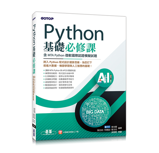 涵蓋Python開發環境建置、變數與資料型別、輸出入函式、選擇結構、重複結構、串列與集合、排序與搜尋、函式、遞迴、字典、套件使用、檔案與例外處理,數據圖表設計、視窗應用程式開發,網頁爬蟲實戰…等。為初學者建立前進大數據、機器學習與人工智慧的基礎。