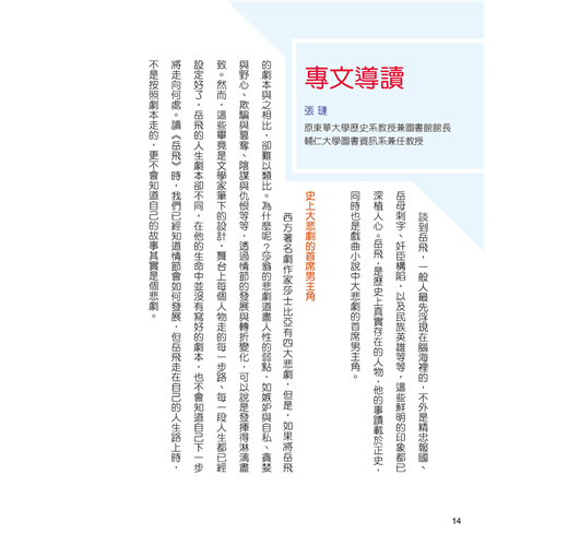 西方著名劇作家莎士比亞有四大悲劇,但是,如果將岳飛的劇本與之相比,卻難以類比。為什麼呢?莎翁的悲劇道盡人性的弱點,如嫉妒與自私、貪婪與野心、欺騙與篡奪、陰謀與仇恨等等,透過情節的發展與轉折變化,可以說是發揮得淋漓盡致。然而,這些畢竟是文學家筆下的設計,舞台上每個人物走的每一步路、每一段人生都已經設定好了,岳飛的人生劇本卻不同,在他的生命中並沒有寫好的劇本,也不會知道自己下一步將走向何處。讀《岳飛》時,我們已經知道情節會如何發展,但岳飛走在自己的人生路上時,不是按照劇本走的,更不會知道自己的故事其實是個悲劇。