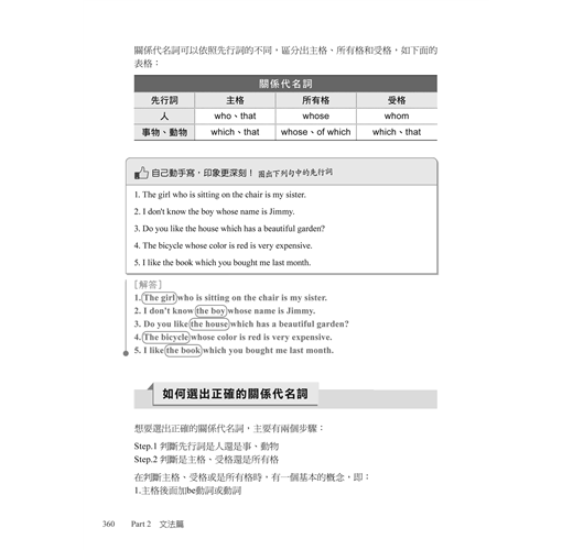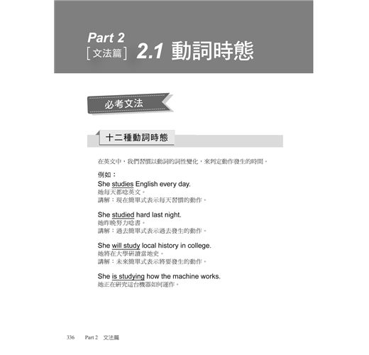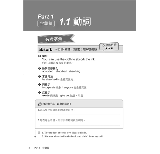 接著,除了單字的記憶外,文法也是考試重點,因此作者特別整理出「文法篇」,針對重要文法加以解說,並用表格整理歸納,更以例句說明且標示重點,加深你的印象。在複習完文法後,更可以利用底下的「實戰練習」題來檢視自我的學習成果。