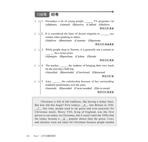 所有的大型考試,除了平日的認真準備,練習歷屆試題也是十分重要的,唯有練習歷屆考題才能清楚的掌握考試脈絡,有助於自己在考場上能臨危不亂,增加得分的機會。因此本書收錄103~108年試題及詳盡解析,除字句中譯外,並針對重要文法觀念加強說明,並有註記關鍵字彙,可多留意。