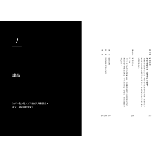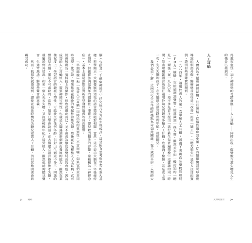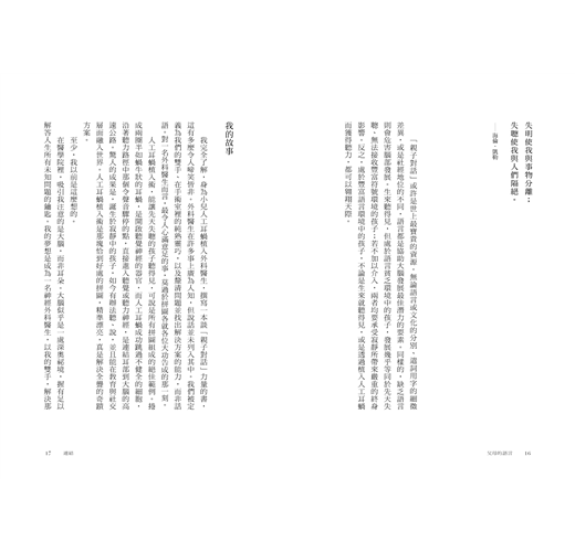 作者基於人工耳蝸植入外科醫師的經驗,提供令人信服的社會科學研究資訊,從對孩童與家庭的深遠承諾獲得啟發。本書幫助我們每個人理解,對嬰幼兒豐富、愉悅而敏銳回應溝通的重要性。告訴每個你認識的人去讀這本書!我們可以在各種類型的家庭與社區,一起豐富下一代的語言環境。這本書難能可貴!──隆納.費格遜(Ronald F. Ferguson),哈佛大學成就落差計畫主任