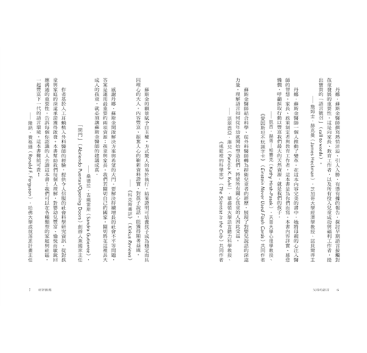 任何關心孩子、關心這國家未來的人,都應當閱讀本書。──芭芭拉.褒曼(Barbara Bowman),艾瑞克森(Erikson Institute)艾爾文.哈里斯(Irving B. Harris)兒童發展研究所教授