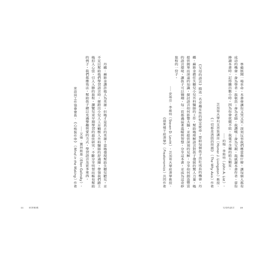 蘇斯金清楚、明瞭而具權威的撰寫本書,闡釋家長為何需要對他們的寶寶說話,以及為何某些溝通形式優於其他形式。《父母的語言》應被列為每個家長、老師及教育政策制定者的閱讀書單。──亞當.奧特(Adam Alter),紐約大學副教授、《粉紅色牢房效應》(Drunk Tank Pink)作者