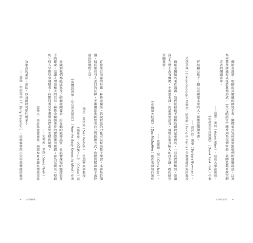 意識到我們都能成為孩子的神經開發者,而互動的純粹品質,會影響探究的態度與孩子的健康,這讓人增加極大的自信。蘇斯金醫師著作的實際應用無窮;身為父親及(堅韌的)投入早期兒童發展者,我期待看見本書帶我們走到怎樣的境地。──史蒂夫.奈許(Steve Nash),史蒂夫.奈許基金會會長、
