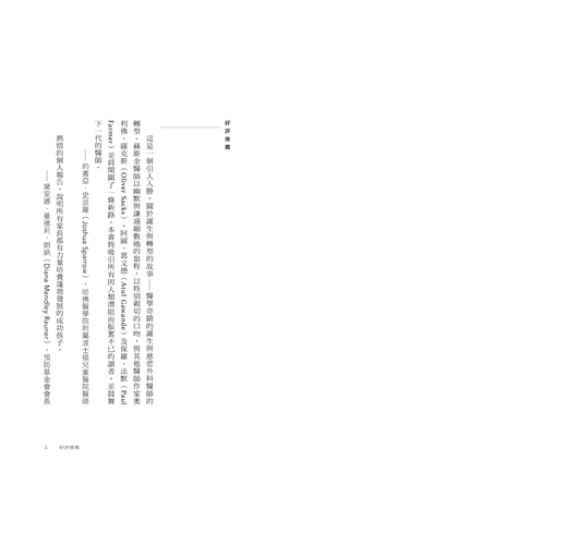 這是一個引人入勝,關於誕生與轉型的故事──醫學奇蹟的誕生與慈悲外科醫師的轉型。蘇斯金醫師以幽默與謙遜細數她的旅程,以特別親切的口吻,與其他醫師作家奧利佛.薩克斯(Oliver Sacks)、阿圖.葛文德(Atul Gawande)及保羅.法默(Paul Farmer)並肩開闢了一條新路。本書將吸引所有因人類潛能而振奮不已的讀者,並鼓舞下一代的醫師。──約書亞.史派羅(Joshua Sparrow),哈佛醫學院附屬波士頓兒童醫院醫師