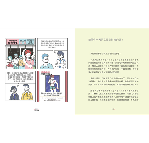 小女孩的玩具不會只有粉紅色,也不是照顧娃娃、扮家家酒這種從家事延伸出的玩意,而是可以毫無顧慮地玩小火車、機器人的世界。沒有人會把掀裙子當成玩笑的世界。不需要在校服裡面再穿一件背心的世界。不會被灌輸「好好讀書才能嫁個好人家」這種觀念的世界。